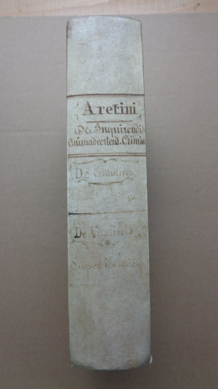 "...de inquirendis animadvertendisque criminibus cui tractatus Alberti de Gandino, nec non Bonifacii de Vitalinis, una cum apostillis Augustini de Arimio, & Hier. Cuchalon, veluti apendices subiecimus. Cum summarijs, & indice locupletiori quàm antea [...] Cum eiusdem Angeli vita, per Thomam Diplobatacium edita". Un volume (14x21 cm) di (42)-467-(1) fogli. Marca tipografica (colomba con ramo d'ulivo) alla pagina di titolo; iniziali xilografiche. Una antica firma di possesso al titolo, qualche rara nota coeva. Ottime condizioni. Legatura ottocentesca in mezza pergamena con titolo manoscritto al dorso. Angelo Gambiglioni, detto l'Aretino visse ed operò come giurista nella prima metà del Quattrocento. Prima fu magistrato; poi insegnò nell'università di Ferrara e per breve tempo in quella di Bologna. Ebbe fortuna un suo commentario alle Istituzioni di Giustiniano e ancora più questo Tractatus de maleficiis (scritto nel 1438 e stampato per la prima volta nel 1472) che tratta del diritto penale, omicidi, calunnie, adulteri, sodomia, ecc. con interessanti capitoli sulla tortura ed altri mezzi per ottenere confessioni.