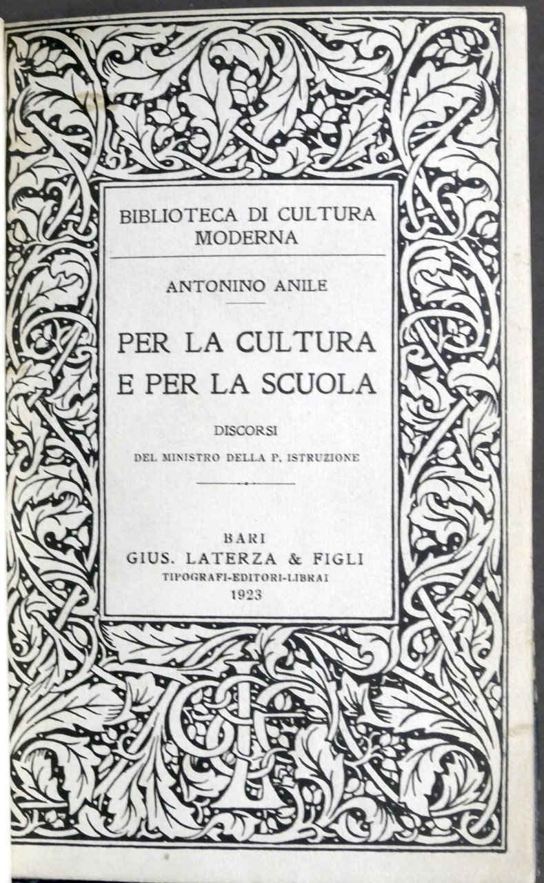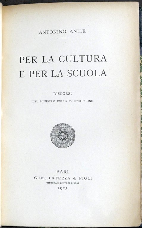 Anile Per la cultura e per la scuola Discorsi ministro pubblica istruzione 1923 | Libri antichi e moderni |