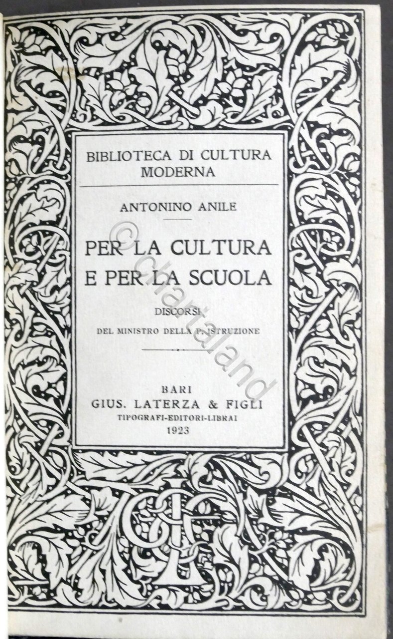 Biblioteca di cultura moderna Antonino Anile - Per la cultura e per la scuola - Discorsi del ministro della pubblica istruzione - 1923 Laterza Pag. 184 Copertina rigida - Testo in italiano. Buone condizioni generali. Alcune pagine con frasi sottolineate.