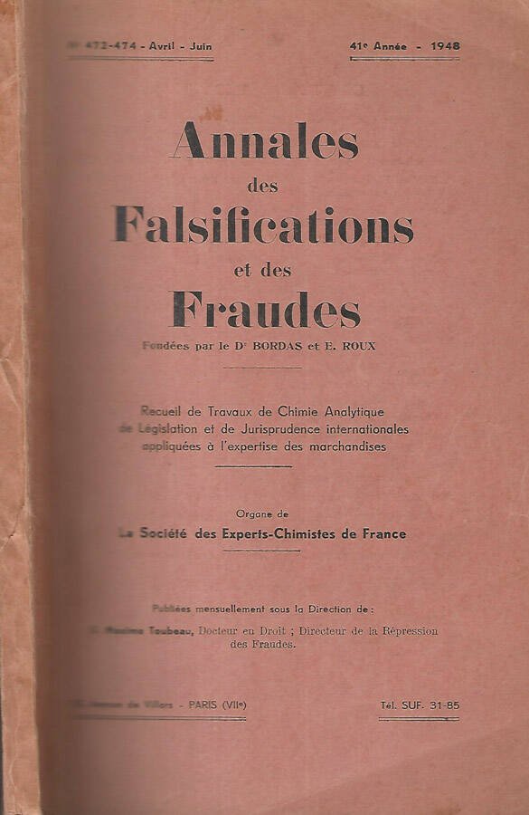Pubblicazione mensile diretta da M. Maxime Toubeau, fondata da Bordas e E. Roux, numero 472-474, dell'aprile-giugno 1948.Raccolta di opere di chimica analitica di legislazione e giurisprudenza internazionale applicate alle competenze merceologiche. Brossura in cartoncino appena brunita ed appena segnata dal tempo. Pagine ingiallite, nel complesso in buono stato e con una tavola in bianco e nero ad inizio testo. Numero pagine 340.
