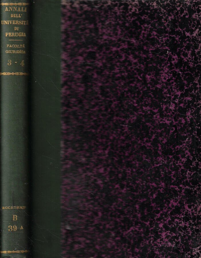 Vol. II, anno 1887-88, della serie degli Annali dell'Università libera di Perugia- facoltà Giuridica. Mezza legatura in tela verde e piatti marmorizzati, con titoli in oro solo al dorso, leggermente scolorita e con usura lungo i margini. Pagine scurite, come pure i tagli, salde, con ampio margine e note al piede. Coperta editoriale in cartoncino. Numero pagine 252.