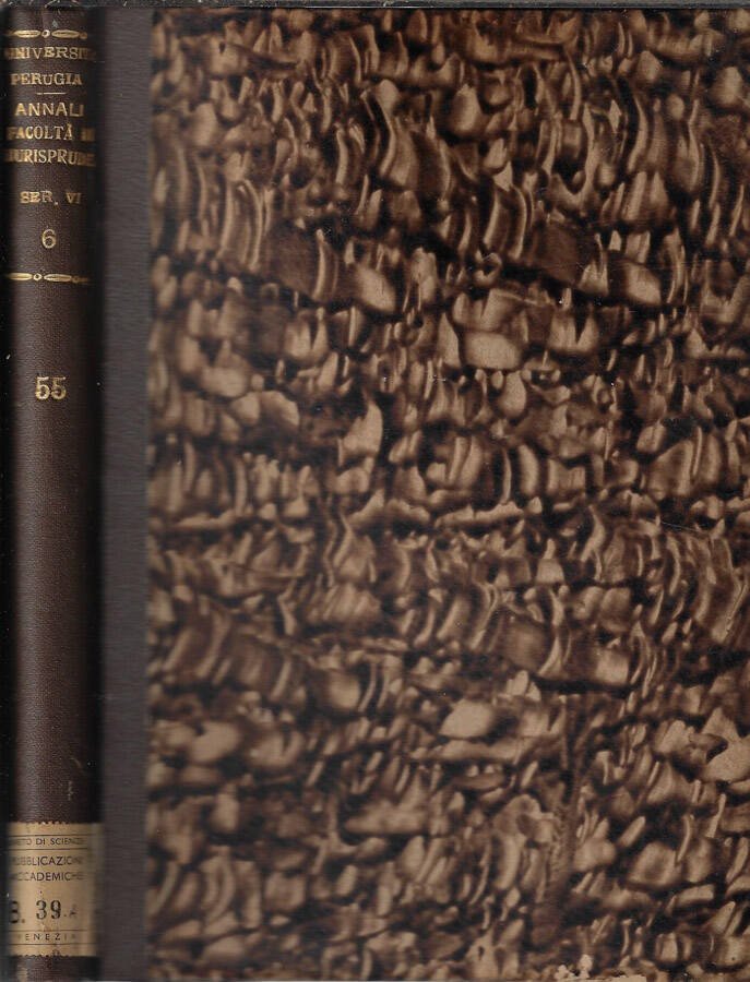 Annali della Facoltà di giurisprudenza R. Università degli Studi di Perugia Vol. LV anno 1941. Il volume potrebbe contenere timbri ed etichette dell'Istituto Veneto, regolarmente acquisito dalla nostra libreria. Coperta rigida in mezza tela ingiallita dal tempo presentante segni di usura ai margini ed ai piatti ed etichetta precedente alla cuffia inferiore del dorso. Pagine fruibili anche se ingiallite dal tempo, in particolare ai tagli. Numero pagine 197.