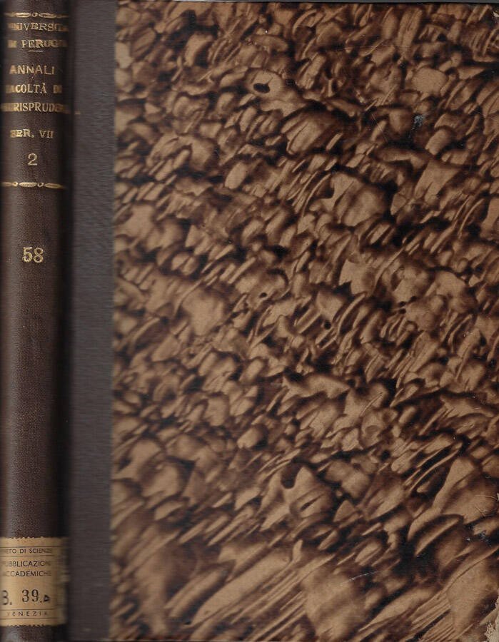 Volume LVIII anno 1947-1948 serie VIII tomo II del periodico dell'Università degli Studi di Perugia "Annali della facoltà di giurisprudenza". Il volume potrebbe contenere timbri ed etichette dell'Istituto Veneto, regolarmente acquisito dalla nostra libreria. Coperta rigida in mezza tela con titoli oro al dorso ingiallita dal tempo presentante segni di usura da scaffale ai margini con abrasioni agli stessi, tracce di usura da sfregamento ai piatti ed etichetta precedente alla cuffia inferiore. Pagine godibili anche se ingiallite dal tempo, in particolare ai tagli. Numero pagine 348.