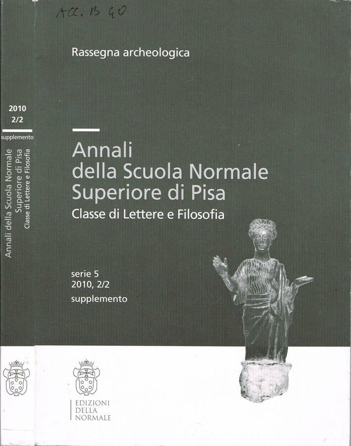 Anno 2010 incompleto, presente un volume, Supplemento agli Annali della Scuola Normale Superiore di Pisa - Classe di Lettere e Filosofia - Serie 5, 2010, 2-2, dal titolo "Notizie degli Scavi di Antichità comunicate dalla Scuola Normale Superiore di Pisa - Rassegna archeologica del Laboratorio di Storia, Archeologia e Topografia del Mondo Antico". Buono stato, coperta illustrata in cartoncino goffrato, su piatto anteriore catalogazione bibliotecaria manoscritta, bordo poco sfregato, lieve abrasione, tagli appena ambrati con qualche macchietta, cerniera stretta, pagine in ottimo stato. Presenta LV tavole, su carta patinata, con illustrazioni in b. e n. fuori testo, qualcuna a colori, una fuori formato, ben piegata. Numero Pagine 265