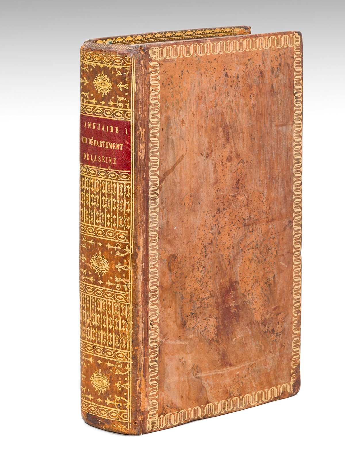 1 vol. in-8 reliure de l'époque pleine basane racinée, dos lisse orné, roulette dorée d'encadrement en plats, coupes et chasses ornées, De l'Imprimerie Bibliographique, Paris, s.d. [ 1805 ], 3 ff., xlvi-604 pp. avec 6 tableaux dépliants Rare exemplaire de la première année de cet almanach qui ne parut que de 1805 à 1808. "L'ouvrage rappelait chaque année l'ordre et la suite des faits mémorables. Il est divisé en trois parties : I Gouvernement de Paris II Statistique sommaire du département de la Seine III Paris considéré comme capitale de l'Empire (toute l'organisation officielle). La seconde partie donne des renseignements intéressants sur Paris en prenant comme base le plan de Verniquet (1791) rectifié. On y trouve le nombre et le numérotage des maisons d'après le décret du 2 février 1805, la nomenclature des Halles (dont une halle au pain), des 22 marchés, des ponts, quais, jardins publics, etc.". Rare exemplaire en belle reliure d'époque (reliure un peu frottée, petite piq. de vers en dos, bon exemplaire par ailleurs). Grand-Carteret, 1457
