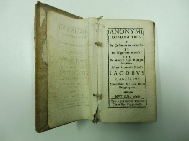 Anonymi dialogi tres. I. De costantia in adversis. II. De Dignitate tuenda. III. De amore erga Rempublicam edidit e privatis schedis Iacobus Cantellus | Libri antichi e moderni | (Bacchini Benedetto)