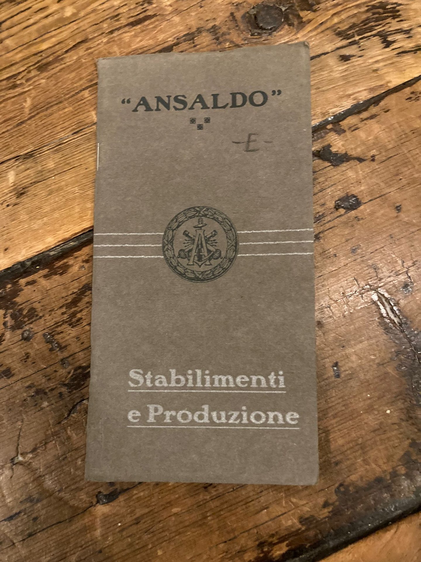In-16° (16.5x8 cm), pp. 59 (3), cartoncino editoriale spillato con titoli in nero e bianco al piatto anteriore con monogramma logotipico. All' antiporta ritratto del fondatore Giovanni Ansaldo (1819-1859), in fine cartina colorata ripiegata raffigurante i vari stabilimenti genovesi. Ottimo esemplare. Non comune opuscolo informativo dei vari stabimenti della celebre ditta fondata nel 1853 in base ad una brillante intuizione del Conte Camillo Benso di Cavour e che produsse la prima locomotiva tutta italiana. Alla produzione di locomotive e imbarcazioni si affianca quello delle navi da guerra e dell' artiglieria, oltre che della trasformazione di minerali in acciaio.