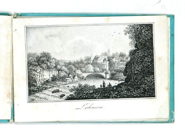15 lithographierte topographische Ansichten. Originaler Pappband in originalem Pappschuber mit gedrucktem Deckeltitel. Kl.-12mo. Unter den Ansichten eine Aussicht vom Dresdner Borsberg, Lohmen, die Basteibrücke, Königstein und Lilienstein, der Amselfall, der Hockstein, Schandau, das Prebischtor, Tetschen etc. - Teils gering braunfleckig; die Bindung stärker gelockert.