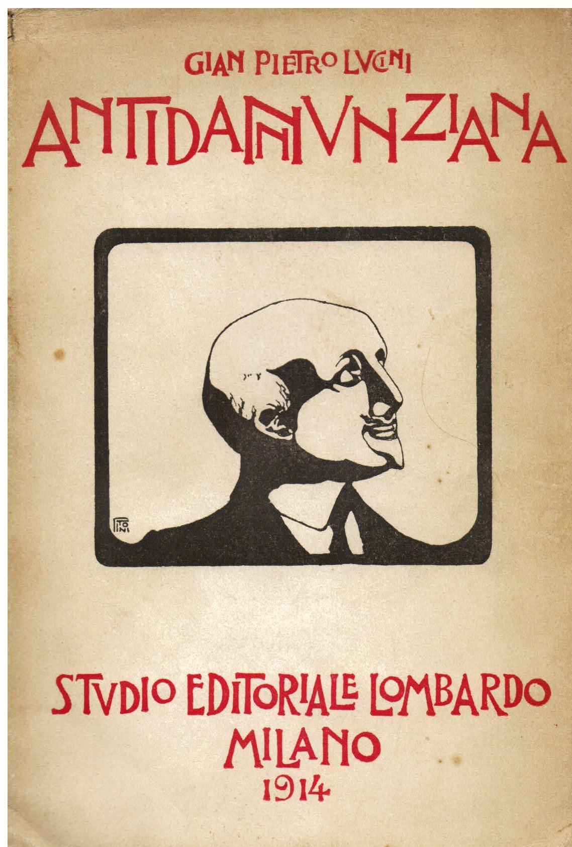 In-8°, pp. 332, brossura editoriale con caricatura di D'Annunzio in xilografia (attribuita ad Enrico Prampolini). Bell'esemplare in barbe. Prima edizione di questo famoso testo di polemica antiannunziana, particolarmente virulento nei confronti della 'sessualità ermafrodita' del 'Martyre de Saint Sébastien'. Scrive Giuseppe Zaccaria: 'Soprattutto va ricordata l'Antidannunziana. D'Annunzio al vaglio della critica (Milano 1914), in cui il Lucini, come già aveva fatto per il futurismo, chiudeva i conti con uno scrittore che pure aveva influito notevolmente sulla sua opera, soprattutto nella fase iniziale, con l'esclusione di Spirito ribelle. Le accuse rivolte a D'Annunzio erano quelle secondo cui 'il conformismo e il superlativo si fondevano nella retorica: cioè nella mancanza di personalità e di sincerità nell'opera d'arte e nella vita'. L'iperbole immaginifica, risolvendosi in esclusivo culto della forma, cercava invano di nascondere il vuoto di significati morali, sicché 'l'opera sua è una collezione di frammenti senza conclusione, perché il suo cervello è incapace di creare delle verità e dei concetti nuovi'. D'Annunzio, e a maggior ragione i dannunziani, rappresentavano quindi l'esatto contrario dell'idea di letteratura sostenuta e praticata dal L.; una seconda parte dell'opera, rimasta inedita, uscì poi a cura di Sanguineti: D'Annunzio al vaglio dell'Humorismo (Genova 1989).' (D.B.I., 66, 2006). E Carlo Cordié: 'Ispirata a una revisione della fama e dei motivi poetici del D'Annunzio, proclamato caposcuola e maestro di vita dopo la morte del Carducci, la disamina del Lucini ha un tono letterario simile a quello del 'Pastore, il gregge e la zampogna' del Thovez. Ma la cultura scapigliata e diseguale del Lucini, la sua partecipazione alla poesia militante, il suo sentire nella letteratura il valore di un agone, conferiscono al libro una fisionomia particolare. Il Lucini indica nuove fonti per i cosiddetti plagi del divo Gabriele, e insieme ne sottolinea la natura di scrittore frammentario e sensuale. Pur nel disordine di argomenti e richiami l'opera è ricca di notizie, di citazioni e di riferimenti polemici a scrittori contemporanei' (Dizionario Bompiani delle Opere, I, p. 194). Gambetti / Vezzosi, p. 466: 'Piuttosto ricercato'. Spaducci, p. 165. Cammarota, Futurismo, 287.8,