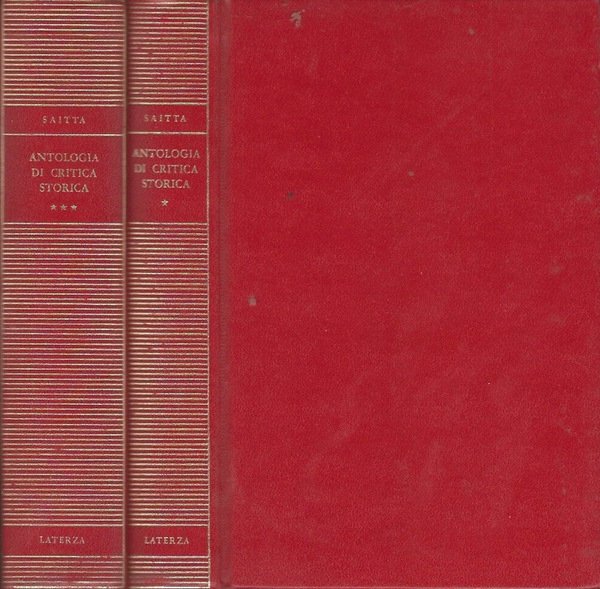 Volume I (551 pag.) e III (755 pag.) di opera incompleta. Antologia di critica storica per le scuole medie superiori. Legature editoriali, copertina rigida, in cartone, finemente rivestite di rosso, con titoli in oro al dorso; tracce d'uso, velature. Pagine in buono stato di conservazione; presenza di sporadiche esottolineature e segni al matita. Numero totale pagine 1306.