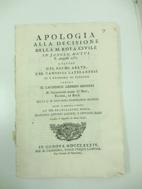 Apologia alla decisione della M. Rota civile. a favore del Rev.mo abate e RR. canonici lateranensi di S. Teodoro di Fassolo contro il causidico Genesio Berneri. Al deputatorio nome de' beni, eredita' ed eredi. | Libri antichi e moderni |