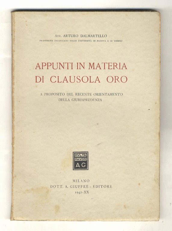 Appunti in materia di clausola oro. A proposito del recente orientamento della giurisprudenza. | Libri antichi e moderni | Dalmartello Arturo.