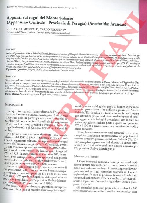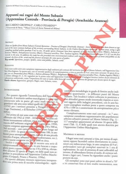 Appunti sui ragni del Monte Subasio (Appennino Centrale - Provincia di Perugia) (Arachnida:Araneae) . | Libri antichi e moderni | Groppali Riccardo - Pesarini Carlo