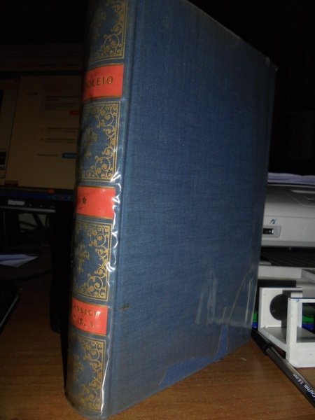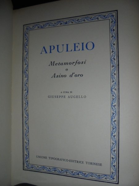 a cura di Giuseppe Augello. Torino, U.T.E.T., 1958. APULEIO. Metamorfosi o Asino d' oro. Prima edizione UTET. In-8°, tela edit. con fregi e titolo in oro al dorso con sovracopertina in acetato. 385 pp. con alcune tavole fuori testo. Carta leggermente ingiallita ai bordi con sovracopertina in acetato che presenta un piccolo strappetto alla base ma molto ben conservato.