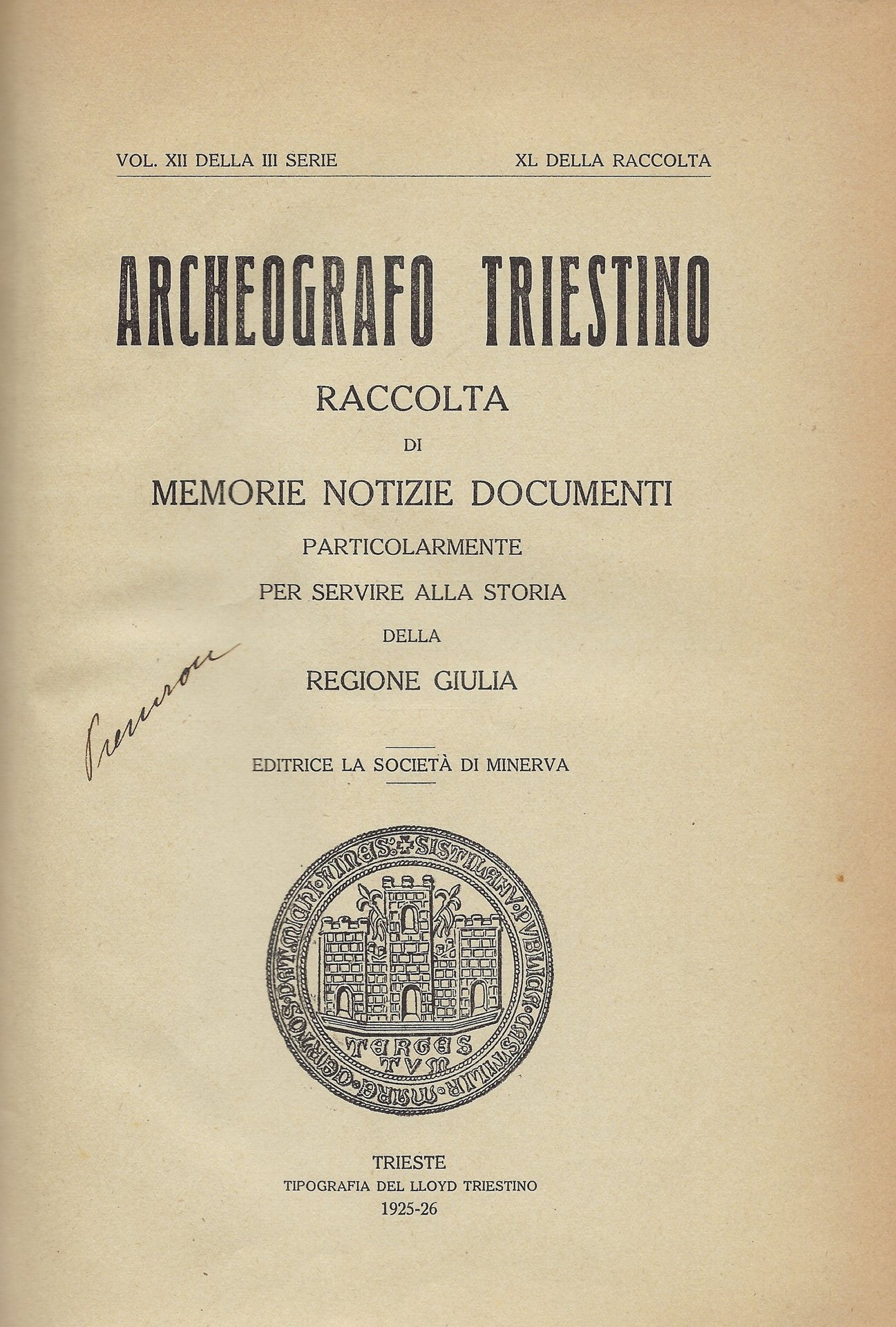 Archeografo Triestino: raccolta di memorie notizie documenti particolarmente per servire alla storia della Regione Giulia. Vol. XII della III Serie, XL della Raccolta.