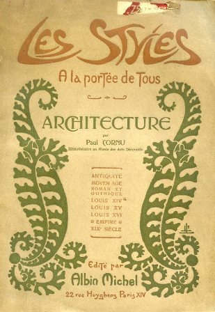 In-8°, pp. (4), 120, III, brossura editoriale con titolo stilizzato in ocra a in verde e fregi fitormorfi in verde. Numerosissime illustrazioni fototipiche e disegni n.t. Lievi ingialliture e tracce d'uso, ma buon esemplare. Firma di possesso di Marziano Bernardi all'occhietto. Agile compendio di storia dell'architettura dall'antichità al XIX secolo. Les Styles a la portée de Tous.