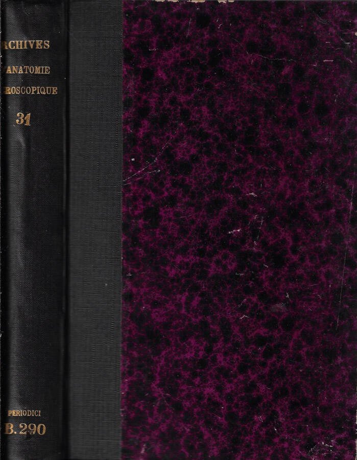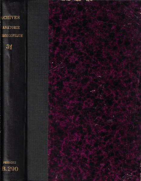Tomo 31 completo anno 1935 del periodico in lingua francese "Archives d'anatomie microscopique". Il volume potrebbe contenere timbri ed etichette dell'Istituto Veneto, regolarmente acquisito dalla nostra libreria. Coperta rigida in mezza tela con titoli oro al dorso mostrante segni di usura ai margini con abrasioni e strappi agli stessi ed al dorso e leggere tracce di usura da sfregamento ai piatti. Pagine brunite dal tempo, in particolare ai tagli. Segni a matita all'occhiello. Numero pagine 458.