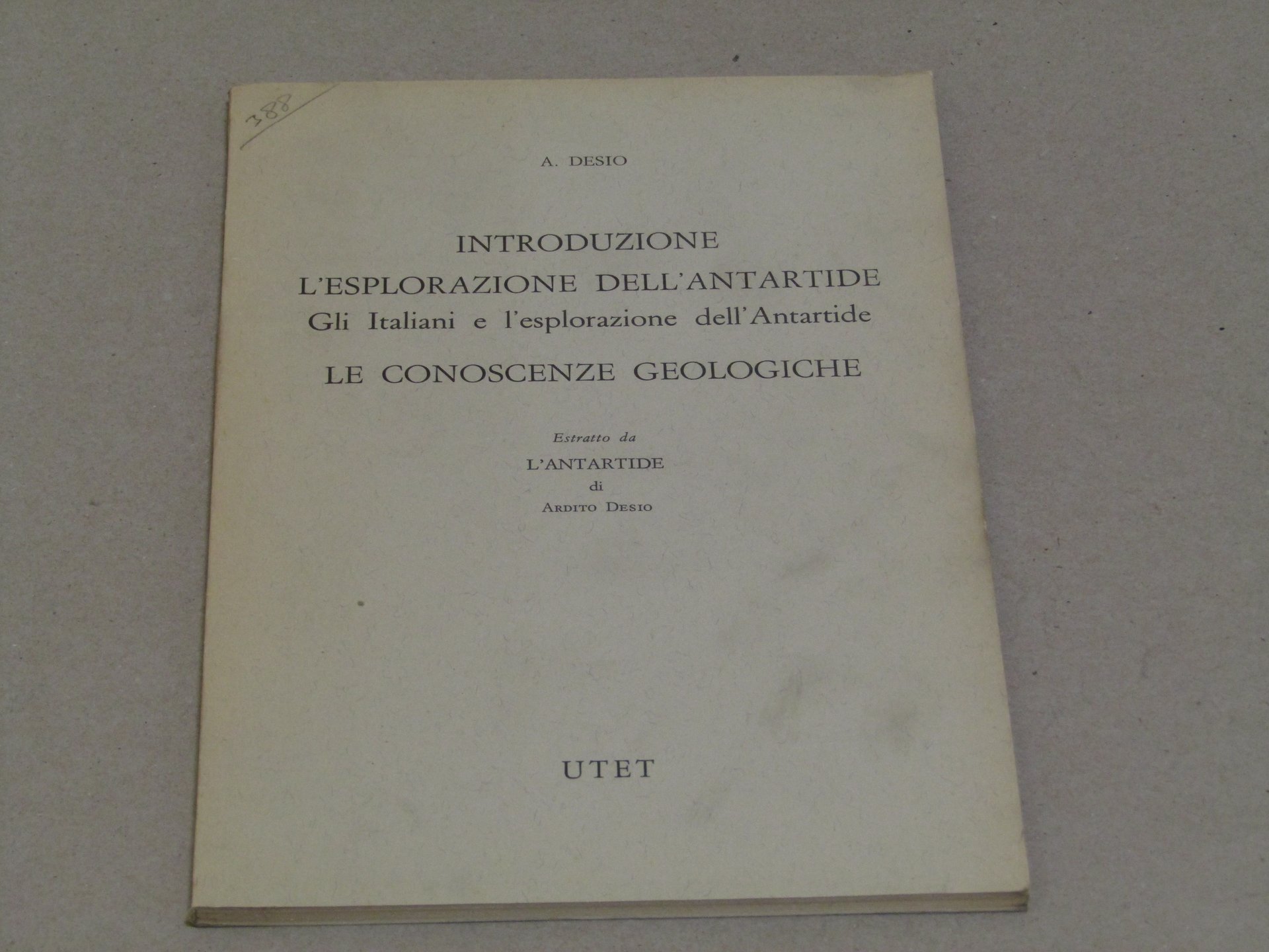 Ardito Desio Ardito Desio. Introduzione l'esplorazione dell'Antartide. Torino, UTET N. D. italiano, in ottavo pp.158 Breve testimonianza sull'esplorazione dell'Antartide. Pagine e copertina lievemente ingiallite.