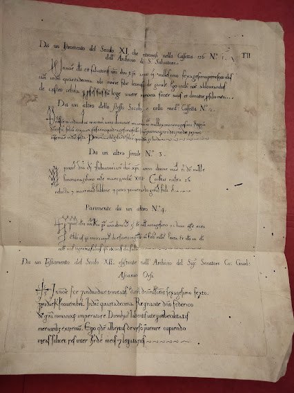 In 8°, cart. muta, pp. XII + 116 + 2 tavv. riproducenti "Istrumenti (Codici medioevali)". UNITO: Copia di lettera manoscritta del Sig. Girolam Tarrarozzi Gerbari al Signor Francesco Perli intorno al libro intitolato Arte di conoscere l'età de' Codici latini e italiani del Padre Trombelli (l'originali trovasi nella pubblica Biblioteca di Roveredo, n. VI in data 14 ottobre 1757). Front. fig. testate, capilettera e finaline. Gore.