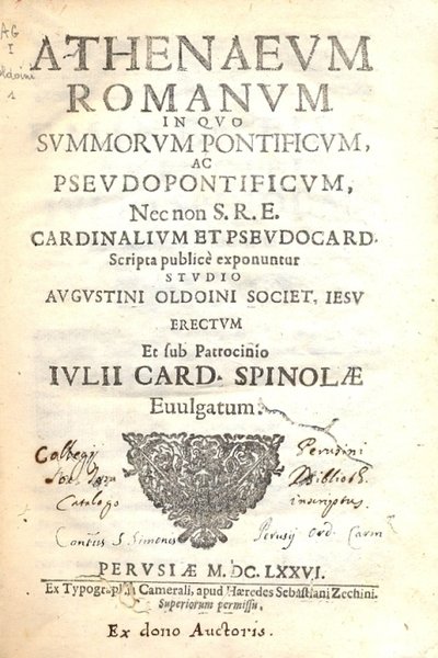 Athenaeum Romanum in quo Summorum Pontificum, ac pseudopontificum, Nec non S. R. E. Cardinalium et pseudocard. Scripta publicé exponuntur. Erectum et sub patrocinio Iulii Card. Spinolae Evulgatum.