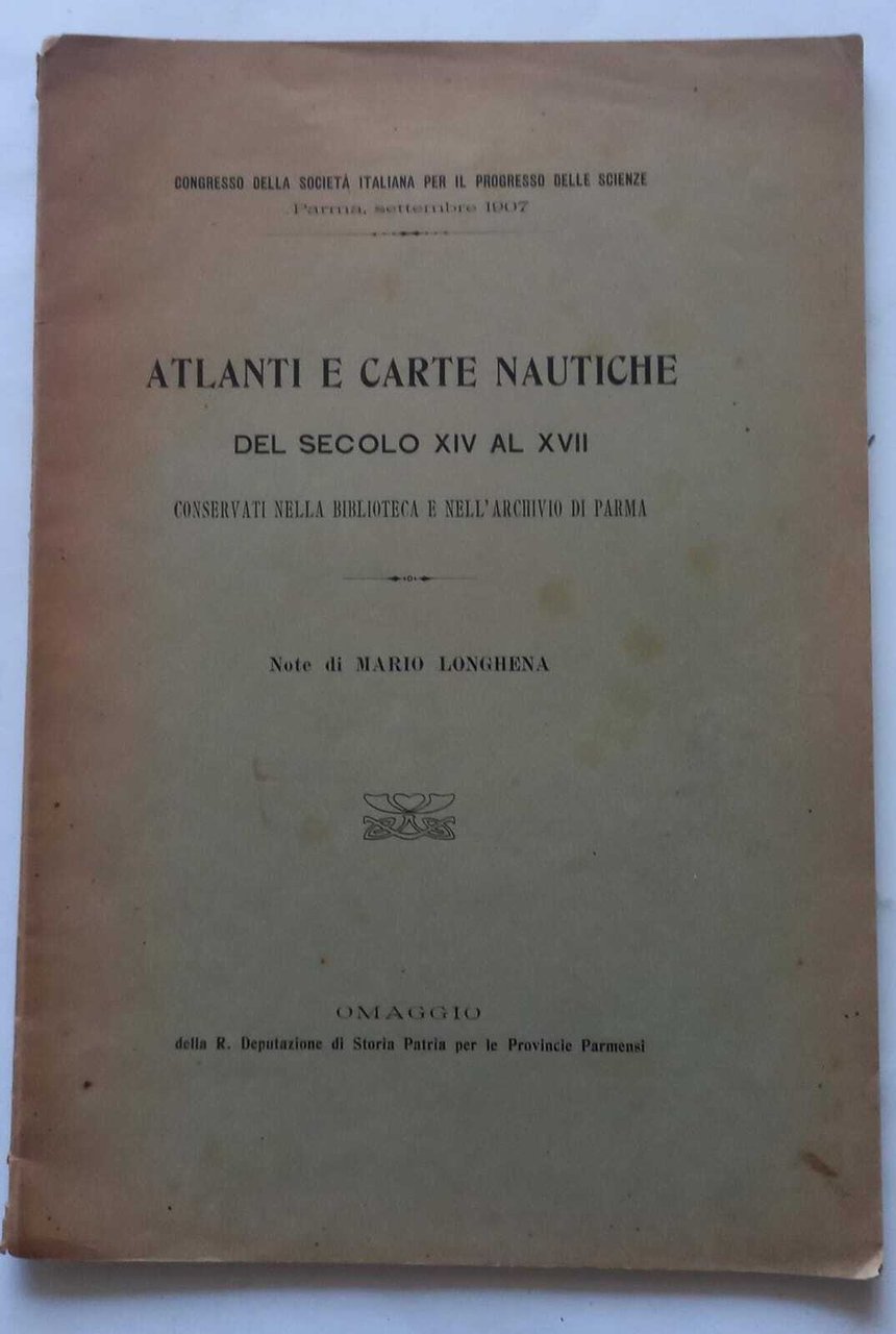 Atlanti e Carte Nautiche del secolo XIV al XVII conservati nella Biblioteca e nell'archivio di Parma. Congresso della Società Italiana per il progresso delle scienze, Prma, settembre 1907. Brossura editoriale sporca e brunita, solo alcune pagine sporadiche fioriture, lo stato è buono. 46 Buono (Good) .