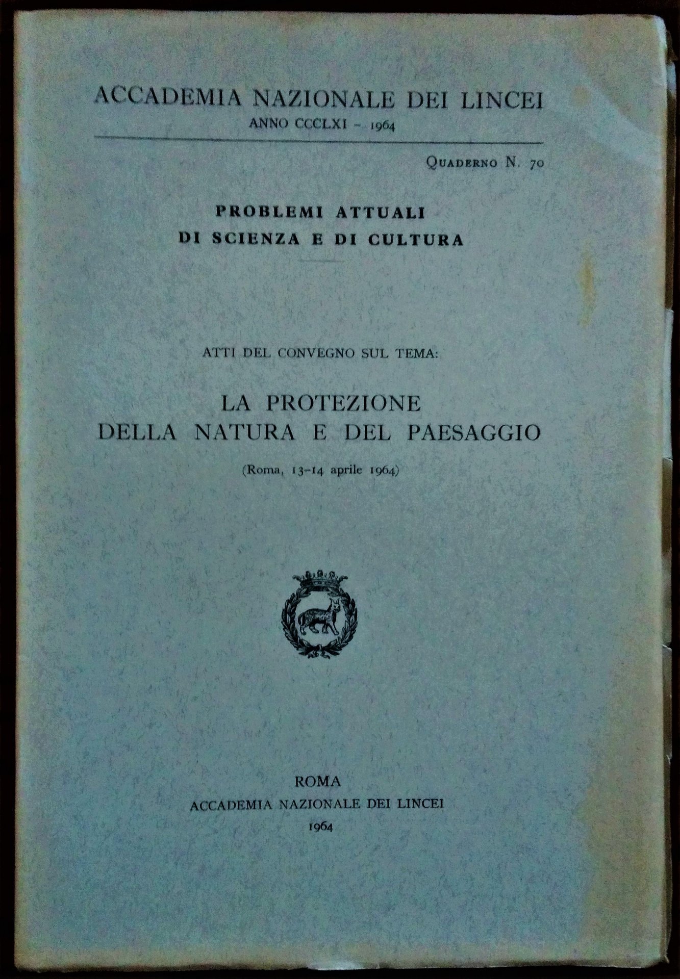 Atti del Convegno sul Tema: La Protezione della Natura e del Paesaggio. ( Roma, 13-14 aprile 1964 ).