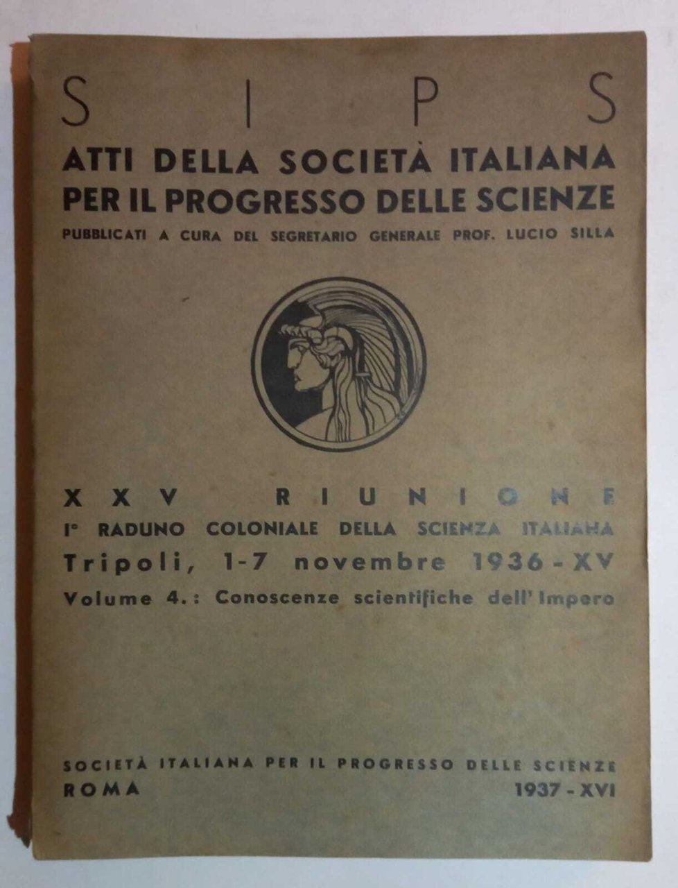 Atti della Società Italiana per il progresso delle scienze, pubblicati a cura del Segretario Generale Prof, Lucio Silla - XXv riunione , primo raduno coloniale della scienza italiana Tripoli 1,7 novembre 1936 - XV Volume 4: conoscenze scientifiche dell'Impero. La brossura editoriale riporta un piccolo taglio al piede del dorso e varie bruniture sui piatti, le pagine sono ingiallite ma in buono stato. 499 Buono (Good) .
