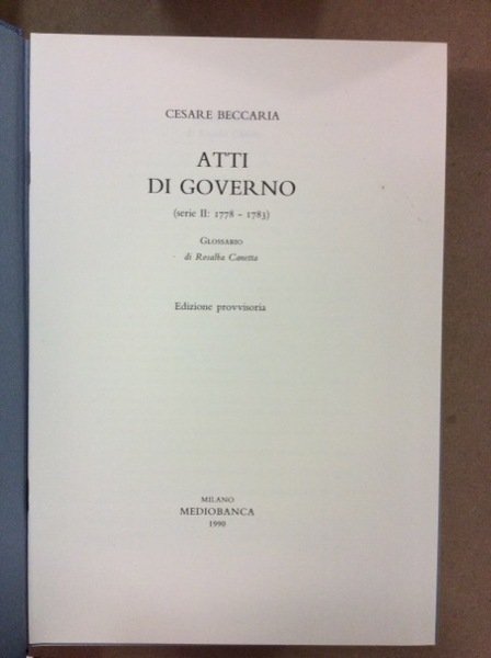 ATTI DI GOVERNO - SERIE II - 1778/1783. Volume VII della Edizione Nazionale delle Opere di Cesare Beccaria, diretta da Luigi Firpo. - A cura di Rosalba Canetta. | Libri antichi e moderni | BECCARIA Cesare