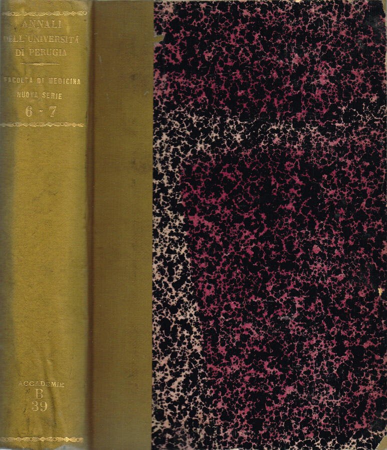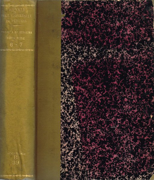 Opera completa composta da due volumi rilegati in un unico tomo, Volume VI - Memorie e Volume VII, della collana Annali dell'Università di Perugia - Facoltà di Medicina - Atti e Rendiconti della Accademia Medico-Chirurgica, a cura del Consiglio Direttivo. Volume VI, del 1894, di 226 pagine, con II tavole con illustrazioni in b. e n., Volume VII, del 1895, di 268 pagine, con II tavole fuoriformato, ben piegate. Volume, in parte intonso, della fine dell'800 in stato discreto, coperta, non coeva, in mezzatela con angoli, piatti marmorizzati, sul dorso fregi e caratteri dorati in bassorilievo, bordo leggermente consunto, ammaccature, abrasione, tagli un po' bruniti con barbe, pagine in buono stato, alcune e margini lievemente ambrati. Il rilegatore ha mantenuto all'interno del tomo i piatti anteriori originali del I.o fascicolo di entrambi i volumi ed i piatti originali del 4.o fascicolo del 1895, in carta, quello anteriore con catalogazione bibliotecaria manoscritta. Presenta timbro ex biblioteca su frontespizio e sul margine di piede di qualche pagina, figure in nero ed in b. e n., marginalia. Numero pagine 494