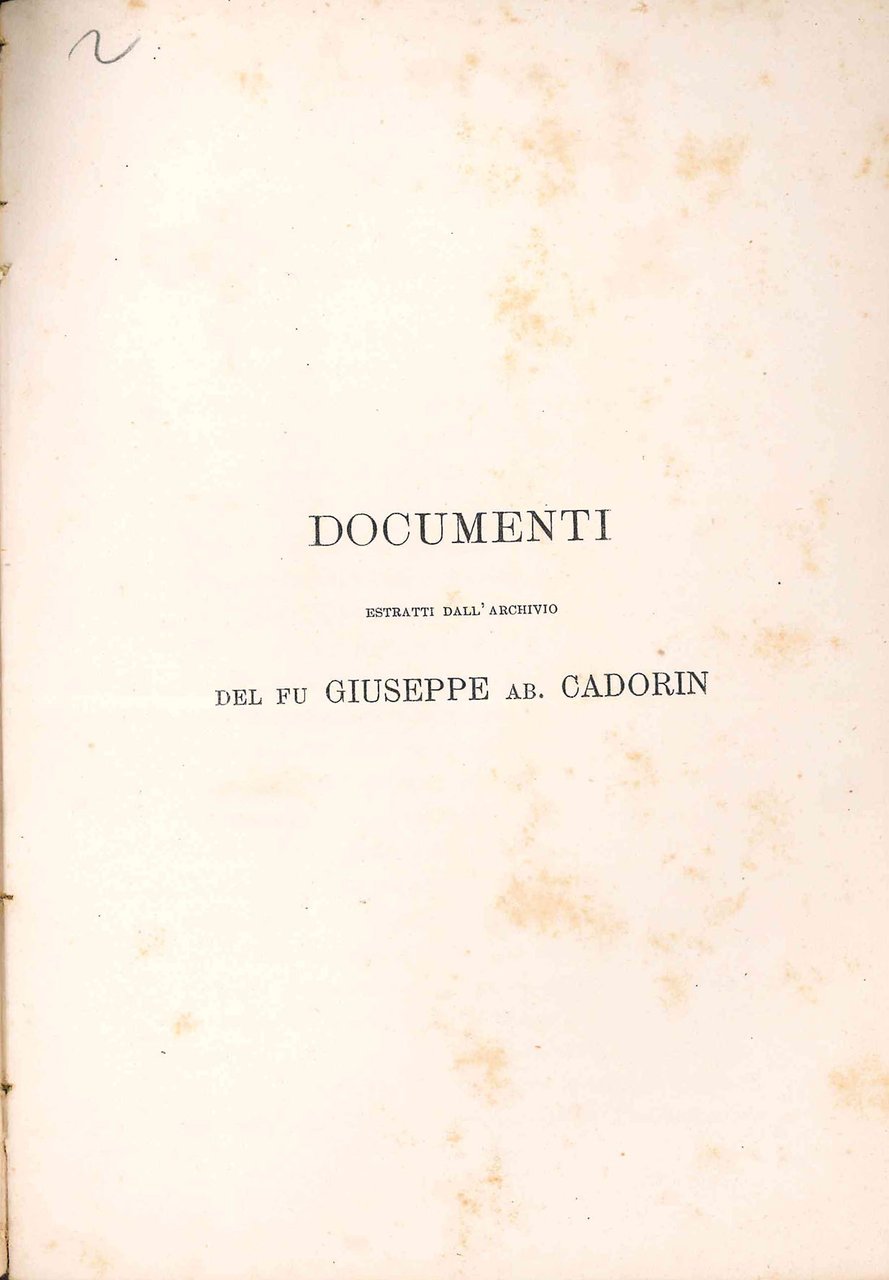 Mm. 220 x 155. Pg. 19, [3 bianche]. Brossura coeva muta, in cartone colorato brunito ai margini; numerose fioriture. Dedica al padre della sposa, dr. Arcangelo Mainardi, da parte del cugino Giovanni Battista Cadorin. Segue una serie di documenti estratti dall'archivio del fu Giuseppe Cadorin e dall'Archivio Generale di Venezia, tra cui una supplica di Giovanni Maria Mainardi, nel gennaio 1527, per avere l'autorizzazione di stampare due nuove opere di filosofia (la traduzione dell'Arte di Galieno e un libro di Epistole Medicinali).