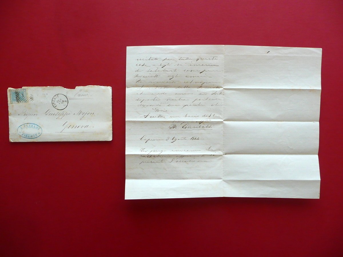 Lettera autografa, Domenico Menotti Garibaldi (1840 - 1903) Lettera autografa firmata datata Caprera, 3 agosto 1864 Lettera autografa firmata su bifolio in carta; testo disposto su due facciate, con firma autografa alla seconda (vedi foto). Cm 21x13,5. Acclusa busta originale di spedizione postale, con sigillo di chiusura in ceralacca ancora conservato (vedi foto). Condizioni di conservazione Lettera ben conservata con tracce d'uso, normali pieghe di spedizione, qualche piccola leggerissima brunitura. Busta originale ben conservata con leggere bruniture, parte sup. con normale apertura dovuta all'estrazione della missiva, e con una circoscritta mancanza. Interessante. Con riferimenti al padre: [.] Papà sta meglio ma è irritato per tutte queste cose. Egli mi incarica di salutarti come pure Ricciotti e gli amici. [.]". SC03.D15533 N "