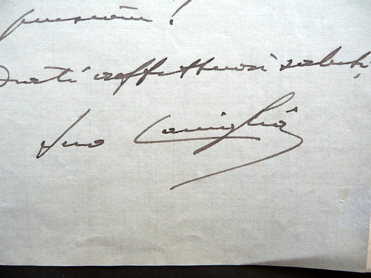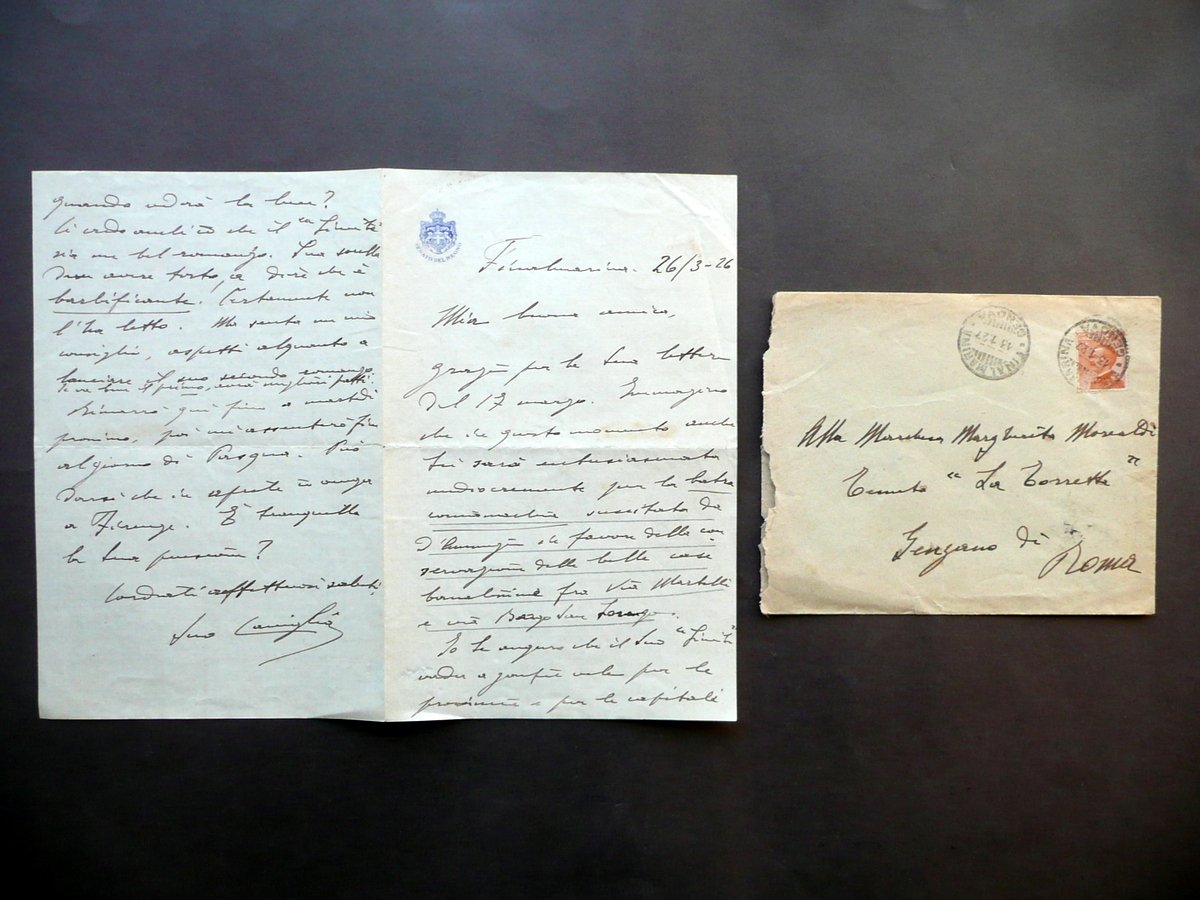 Lettera autografa, Enrico Caviglia (Finalmarina 1862 - Finale Ligure 1945) Lettera autografa firmata Datata Finalmarina, 26/3/1926 Lettera autografa firmata su bifolio in carta con intestazione del Senato del Regno" (vedi foto); testo disposto alla prima e all'ultima facciata; firma autografa al termine del testo (vedi foto); cm 20,5x13,5. Acclusa busta originale di spedizione, anch'essa autografa, la quale reca una data di spedizione differente a quella annotata sulla lettera (è probabilmente relativa ad un'altra lettera; vedi foto). Condizioni di conservazione Lettera ben conservata con tracce d'uso, normale piega centrale di spedizione, poche minime lievissime bruniture; angolo sup. delle prime due facciate con una lieve traccia di pieghetta, alcune righe della prima facciata con una lieve rimovibile sottolineatura a matita del precedente collezionista (vedi foto). Busta di spedizione autografa anch'essa ben conservata con tracce di utilizzo; margini con minimi accenni d'ingiallimento e un minuscolo strappetto; un margine est. aperto per estrazione della missiva (vedi foto). Lunga lettera autografa firmata del Caviglia, diretta alla Marchesa Margherita Monaldi (Tenuta "La Torretta", Genzano di Roma). Tra i vari temi anche un commento pungente su D'Annunzio: "[.] Anche lei sarà entusiasmata mediocremente per la batracomiomachia suscitata da D'Annunzio in favore della conservazione delle belle case [.]". La busta di spedizione autografa reca sempre il nome e l'indirizzo della Marchesa, ma è di un'altra data (probabilmente è relativa ad un'altra lettera). SC03.D12096 N "