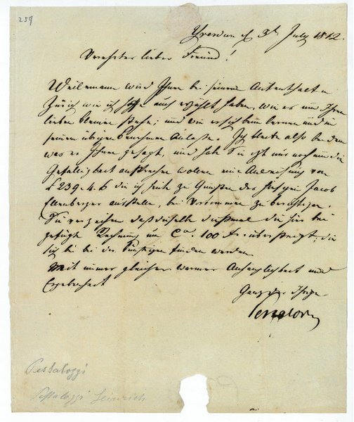 4to. 1 page. Unpublished letter to the Zurich merchant David Esslinger, in business matters: "Verehrter lieber Freund! Weilemann [i.e. the linguist Johann Jakob Weilenmann, 1787-1827] wird Ihnen bei seinem Aufenthalt in Zürich wie ich hoffe auch erzählt haben, wie es um Ihren lieben Kleinen stehe; und wie er sich beim lernen und in seinem übrigen Benehmen anlaße. Ich bleibe also bei dem was er Ihnen gesagt, und habe Sie itzt nur noch um die Gefälligkeit ansprechen wollen eine Anweisung von £239 4s die ich heute zu Gunsten des hiesigen Jacob Ellenberger ausstelle, bei Vorkommen zu berichtigen. Sie verzeihen daß dieselbe dießmal die hier beigefügte Rechnung um ca. 100 Fr. übersteigt, die sich bei bei der künftigen finden werden [.]". - Slight damage to edges, traces of folding. - Pestalozzi, Sämtl. Briefe VIII (Zurich 1966), no. 3014 (without the text).