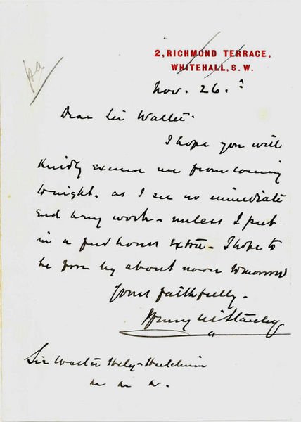 8vo. 1 p. To Sir Walter: "I hope you will kindly excuse me from coming tonight as I see no immediate end to my work - unless I put in a few hours extra. I hope to be free by about noon tomorrow [.]". - The Anglo-Irish diplomat and colonial administrator Sir Walter Francis Hely-Hutchinson (1849-1913) served as Governor and Commander-in-Chief of Natal and Zululand (1893 to 1901) and as Governor of the Cape Colony (1901ff.). - On paper with embossed address; reverse with traces of mounting.