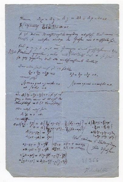 Large 8vo. 4 pp. on 2 sheets. Mathematical manuscript with numerous formulae and equations as well as several remarks: "Wenn [equation] so ist keine Strahlungsbewegung möglich. Und wenn Strahl[en or -ung], so müssen einige der Größen von 0 verschieden sein [.]". - In ink and pencil on blue paper; large tears to folds; slight defects to edges. In old collector's folder.