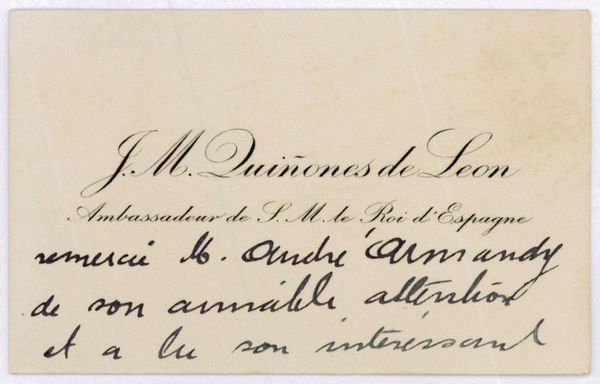 4 lignes. To thank the novelist André Armandy for sending him a book: "[J. M. Quiñones de Leon Ambassadeur de S. M. le Roi d'Espagne] remercie M. André Armandy de son aimable attention et a lu son intéressant livre avec grand intérêt".