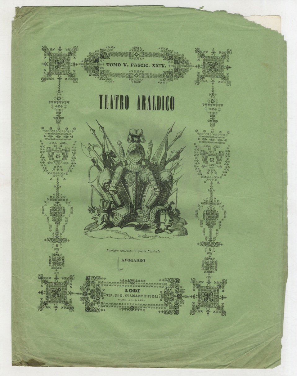 Lodi, Wilmant e figli, 1841-1848, in-4, brossura editoriale, pp. [110]. Con numerosi stemmi accuratamente miniati a mano all'epoca, in vividi colori, con particolari dorati e argentati, su undici tavole f.t. Fascicolo a fogli sciolti, dedicato alla storia della famiglia, tratto da "Teatro araldico, ovvero Raccolta generale delle armi ed insegne gentilizie delle più illustri e nobili casate che esisterono un tempo e che tuttora fioriscono in tutta Italia" di Leone Tettoni e F. Saladini, Lodi, Wilmant e figli, 1841-1848. Lievi difetti marginali alla brossura: buone condizioni.