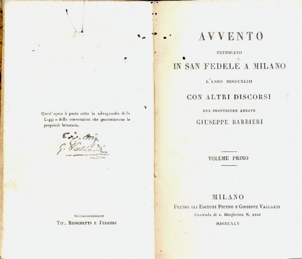 Avvento predicato in San Fedele a Milano l'anno 1843 con altri discorsi. | Libri antichi e moderni | Barbieri Giuseppe.