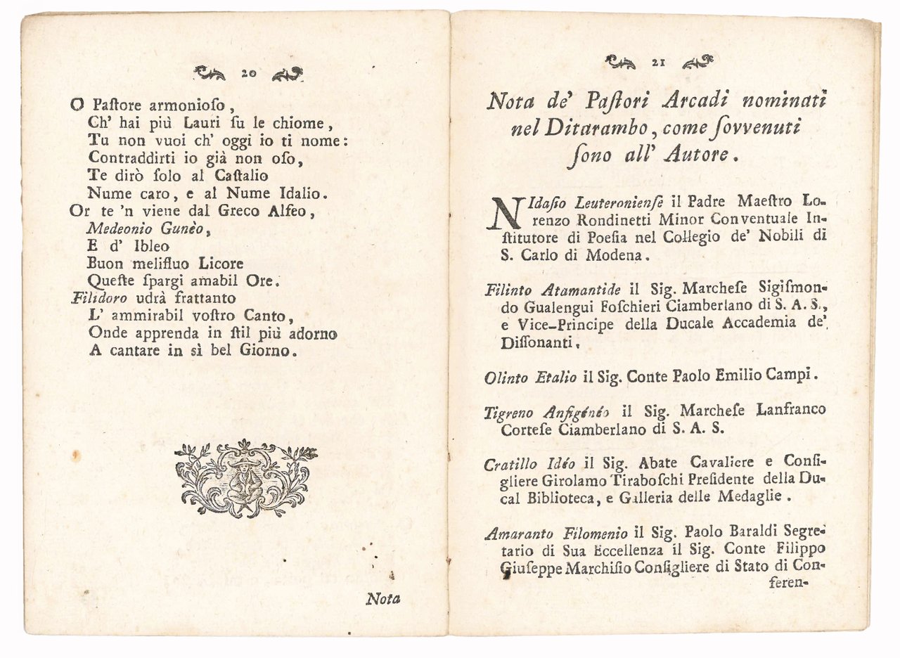 Rare original edition, dedicated by the author, who disguises himself under the Arcadian name of Filidoro Meonidense, to the members of the Accademia dei Dissonanti and of the Panaro branch of the Arcadia, of this dithyrambic poem dedicated to the race of the barbary horses held in Modena in 1781. In the note to the reader, the poet states that he composed it in just two days in order to have it printed in time for the event. At the end is the Nota de' Pastori Arcadi nominati nel ditirambo, come sovvenuti sono all'Autore, i.e. the list of the poetic and real names of the Arcadian poets mentioned in the poem. Vicini was a prolific poet and is the author of several ephemeral publications, a collection of Rime (Modena, 1736), as well as a poem about the Modena wines (I vini modanesi baccanale, Modena, 1752).