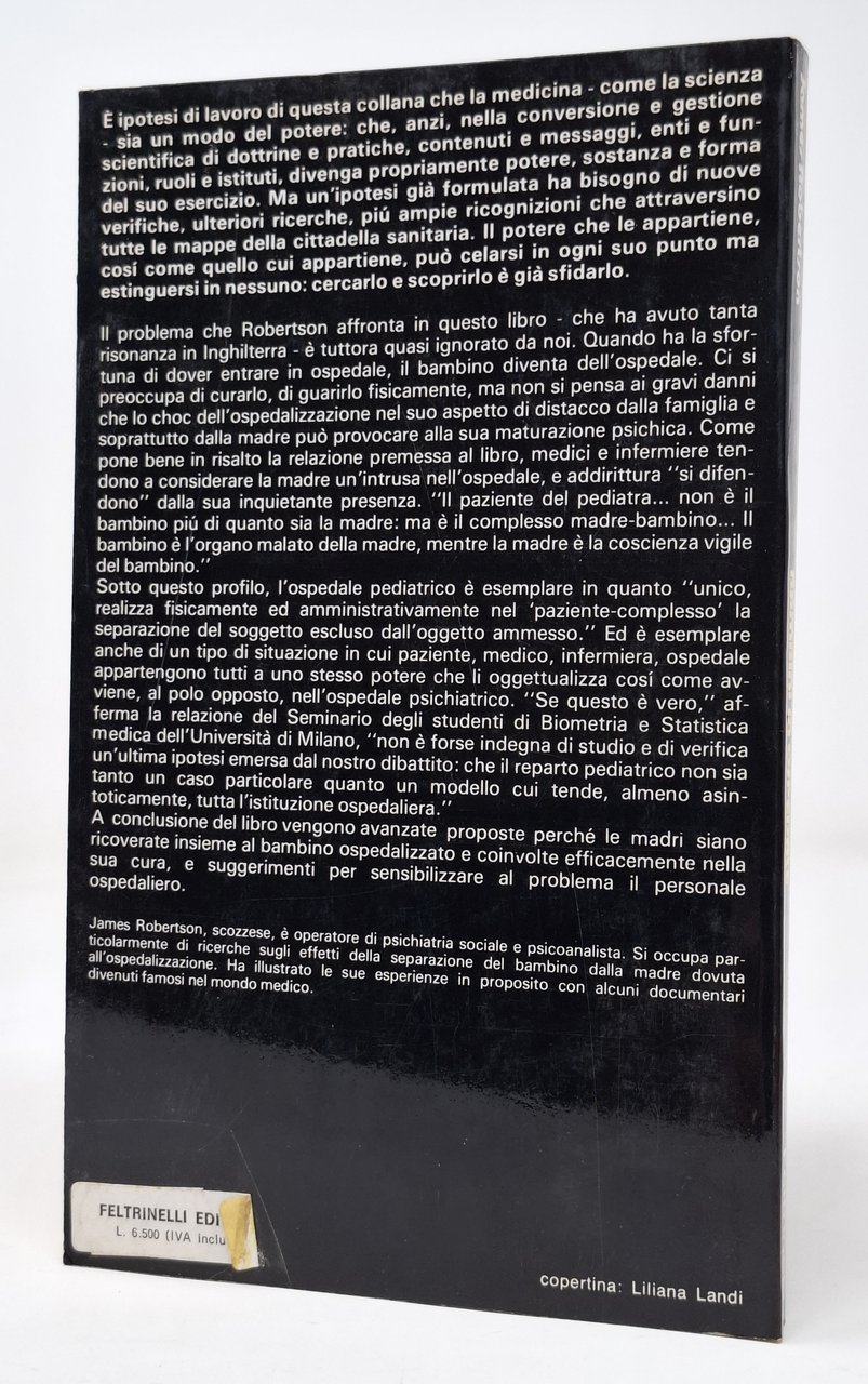 Serie: Medicina e potere, collana diretta da Giulio A. Maccacaro (n. 3). con saggio introduttivo 'Il bambino è dell'ospedale?' del Seminario degli Studenti di Biometria e Statistica medica dell'Università di Milano. Traduzione dall'inglese di Leo Nahon. Seconda edizione: marzo 1976. 2 illustrazioni nel testo e 13 tavole in nero fuori testo. Fotografie di Alberto Galmozzi. Pagine: XL + 149. Formato: 12,5 x 20,5 cm circa. Stato di conservazione: ottimo esemplare. Privo di sottolineature, annotazioni, firme d'appartenenza o altri segni nel testo. Rilegatura decisamente compatta (sembrerebbe non essere mai stato aperto). Copertina editoriale flessibile.