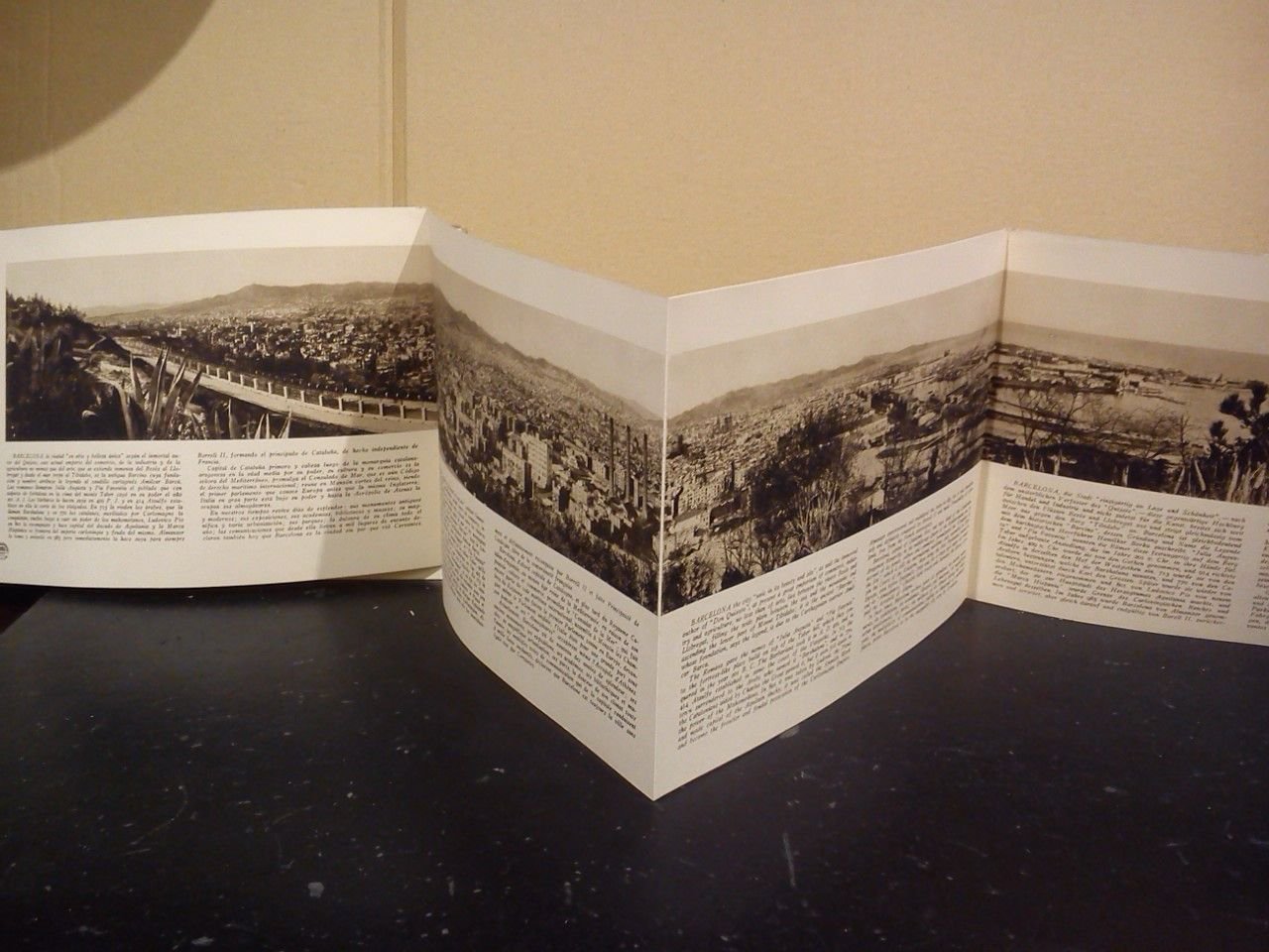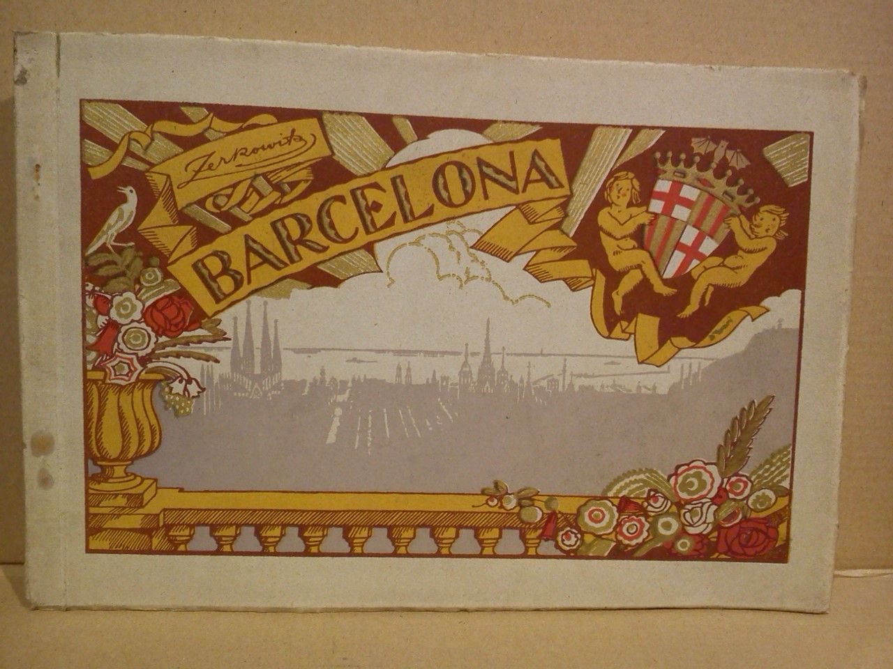 Barcelona: Huecograbado Mumbrú, [s. a., ca. 1925].- Album de 28 folios que presentan ilustración fotográfica a una sola página, a excepción de la primera ilustración que ocupa 4 folios desplegables presentando una bella vista panorámica de toda la ciudad, texto cuatrilingüe (español-francés-inglés-alemán) al pie de cada ilustración; 8º apaisado (17 x 25 cm); Cartulina Ed. flexible con la cubierta ilustrada.* CATALUÑA