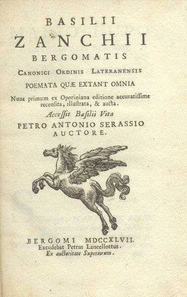 BASILII ZANCHII BERGOMATIS CANONICI ORDINIS LATERANENSIS POEMATA QUAE EXTANT OMNIA. Nunc primum ex Oporiniana editione accuratissime recensita, illustrata, & aucta. Accessit Basilii Vita Petro Antonio Serassio auctore. | Libri antichi e moderni | Zanchi Basilio.