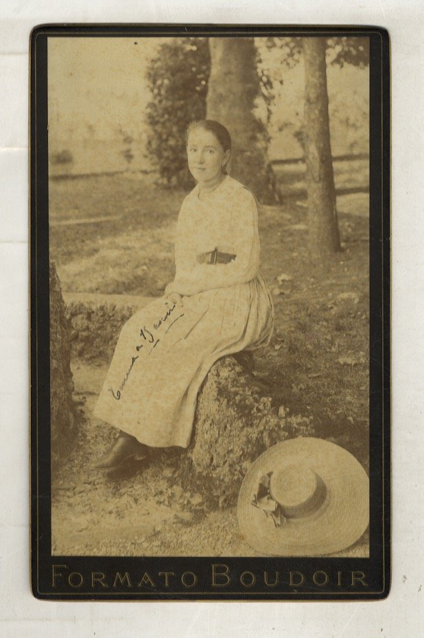 [S.l., Italia, Firenze?], [s.n.], [anni '10 del Novecento], mm. 191x120, applicata su cartoncino rigido nero di mm 213x135, con la scritta dorata "formato boudoir" sul margine inferiore. Una nota manoscritta coeva sulla gonna della ragazza: "Emma a 15 anni"