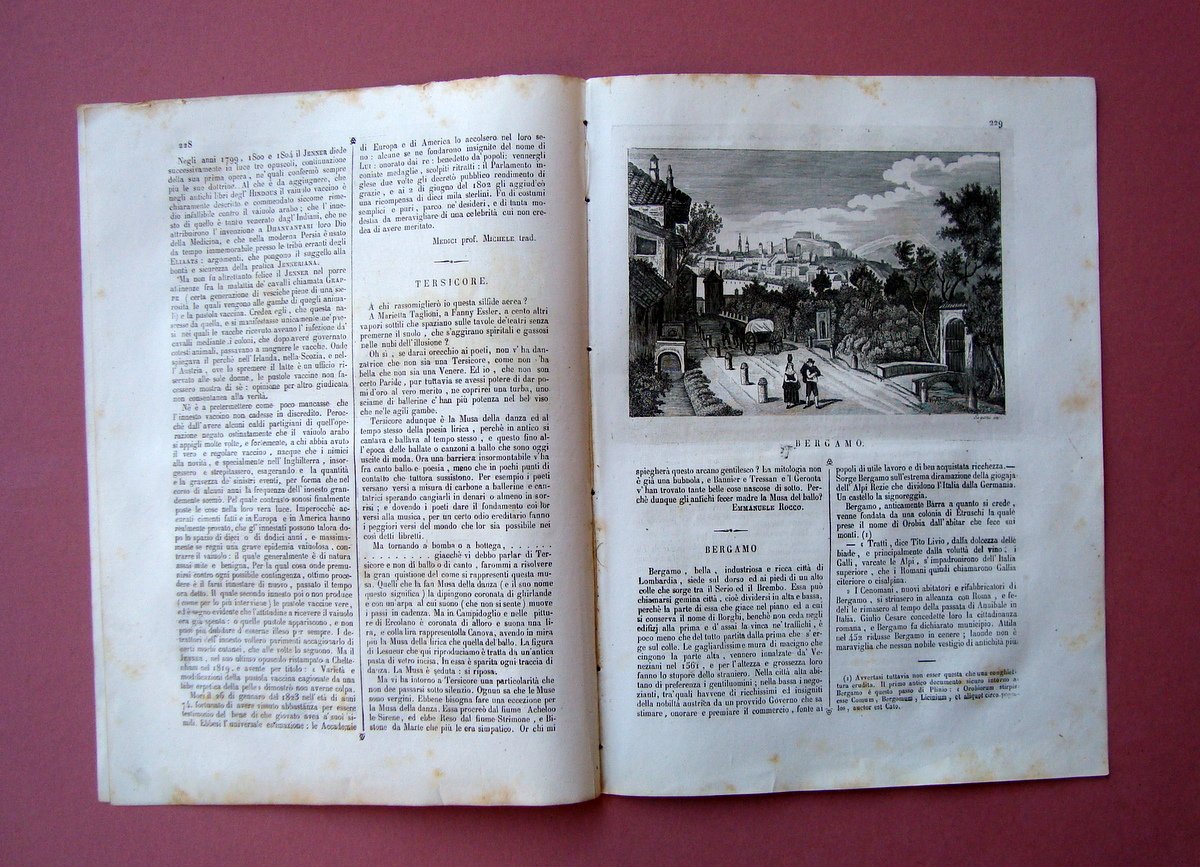 Tip. L'Omnibus, Napoli, 1839; cm 29,5x21,5; pp. 8 da pag. 225 a pag. 232 con num. progr. annuale; fascicolo con grafica dell'epoca e bella incisione + articolo "Bergamo".