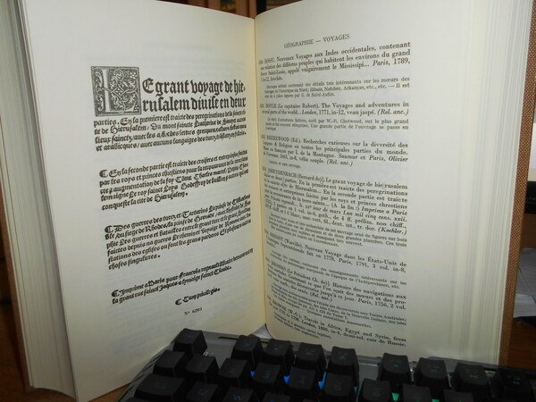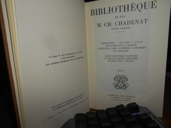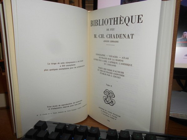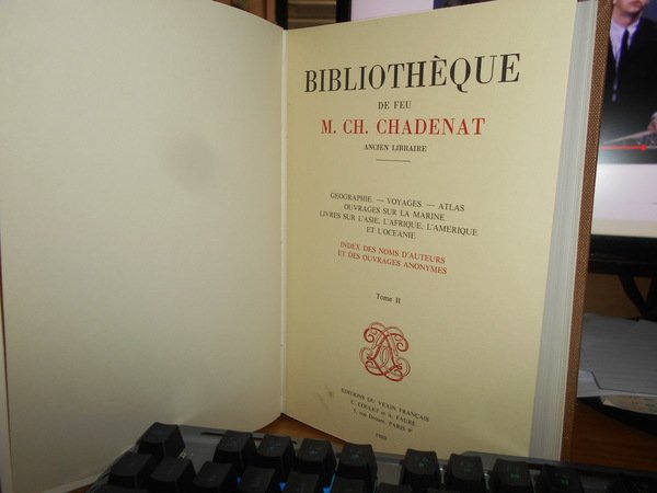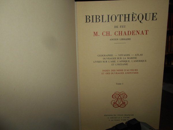 Bibliothèque de Feu M. CH. CHADENAT Ancien Libraire. Paris, Editions du Vexin Français, 1980. Bibliothèque de feu M. CH. CHADENAT Ancien Libraire. 2 volumi in-8°, tela con titoli in oro entro tasselli ai dorsi, brossure originali conservate. Vol. I. Geographie - Voyages - Atlas - Ouvrages sur la Marine - Livres sur l' Asie. L' Afrique, l' Amerique et l' Oceanie. Index des noms d' auteurs et des ouvrages anonymes etablis par C. Coulet. Complessive 7210 opere descritte, pagine non numerate. In fine del vol. II. prix d' adjudication. Come nuovi in tiratura di soli 800 esemplari. Uff. B - III - 6