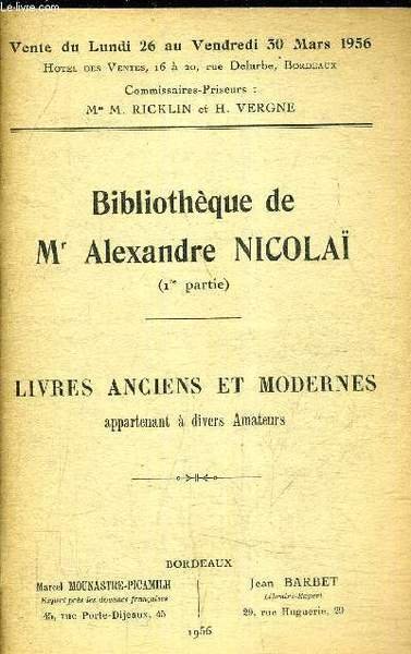 BIBLIOTHEQUE DE MR ALEXANDRE NICOLAI 1RE PARTIE - LIVRES ANCIENS ET MODERNES APPARTENANT A DIVERS AMATEURS - VENTE DU LUNDI 26 AU VENDREDI 30 MARS 1956 - HOTEL DES VENTES BORDEAUX. | Libri antichi e moderni | M.Ricklin & H.Vergne