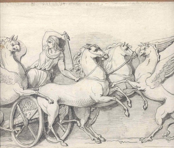 Disegno a matita su foglio di cm. 21 x 30 ca. , raffigurante biga romana attaccata da due grifoni.