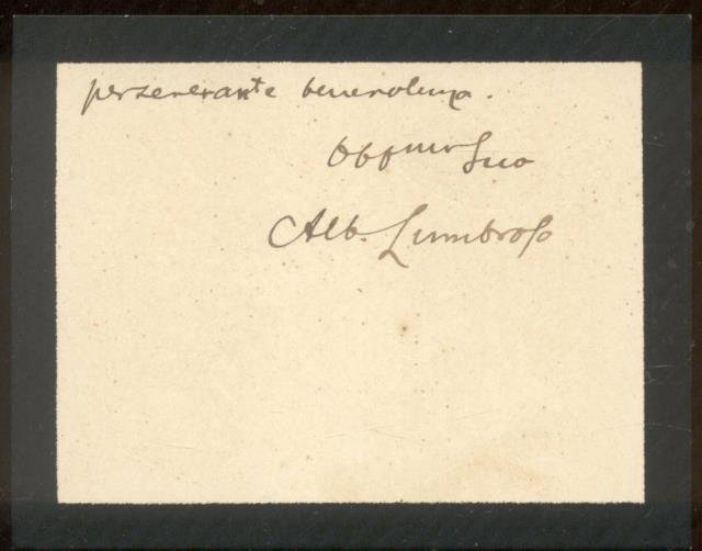 Biglietto in formato cm.19x11,5, listato a lutto, compilato al recto e al verso rispettivamente su 8 e 3 righe. Il biglietto, datato semplicemente 14 giugno, con impresso il monogramma "AL" ed il motto "Verso il ver, verso il buono", è inviato ad anonimo destinatario per accompagnamento di un libro, con firma "Alb. Lumbroso", e fa cenno alla scomparsa del padre. Alberto Lumbroso (Torino, 1872-1942) fu fecondo studioso napoleonico e direttore della "Revue Napoleonienne". Codice libreria 160975.