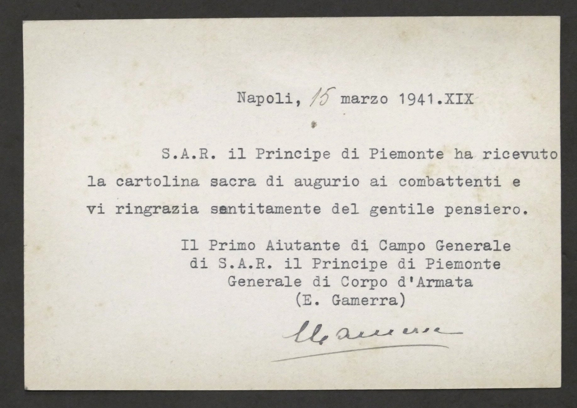 Biglietto di ringraziamento con autografo di E. Gamerra Primo Aiutante di Campo Generale di S.A.R. il Principe di Piemonte - 1941 Dimensioni: 10 x 15 cm ca. Lingua italiana. Buone condizioni generali.