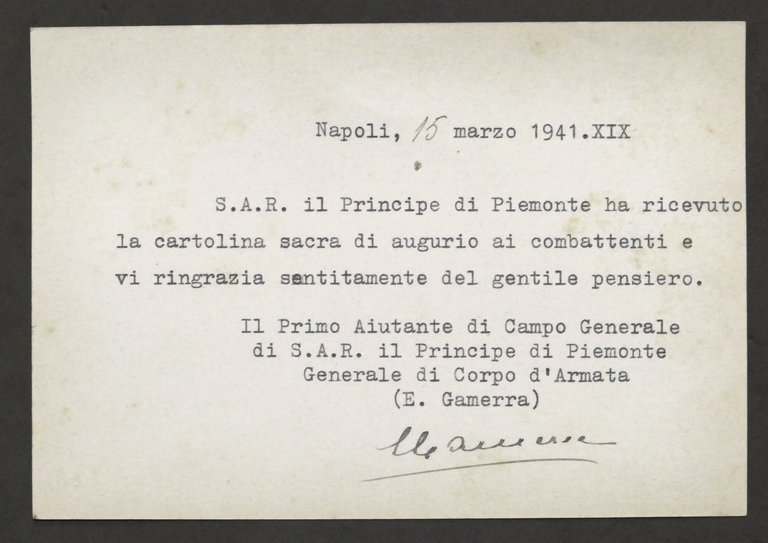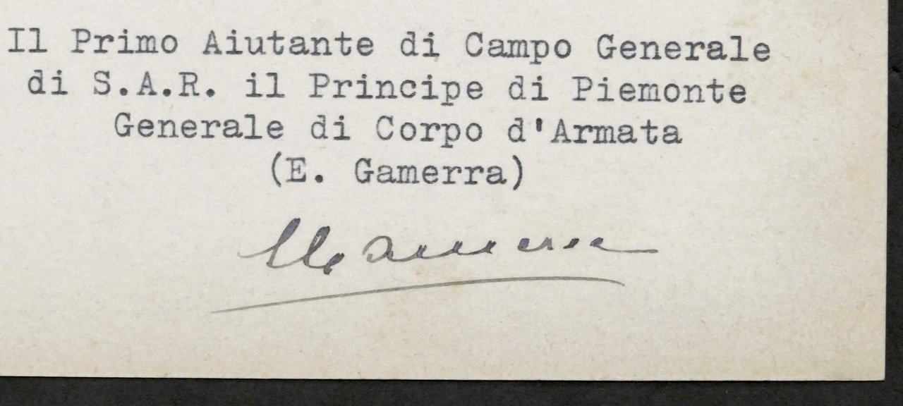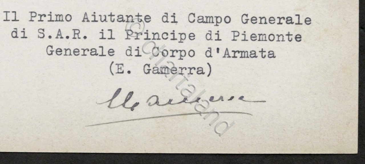 Biglietto con autografo di E. Gamerra Primo Aiutante di Campo di S.A.R. - 1941